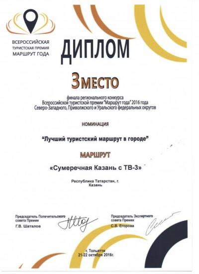 Экскурсия "Сумеречная Казань с ТВ-3" стала призером на региональном финале Всероссийской премии Маршрут Года в г.Тольятти