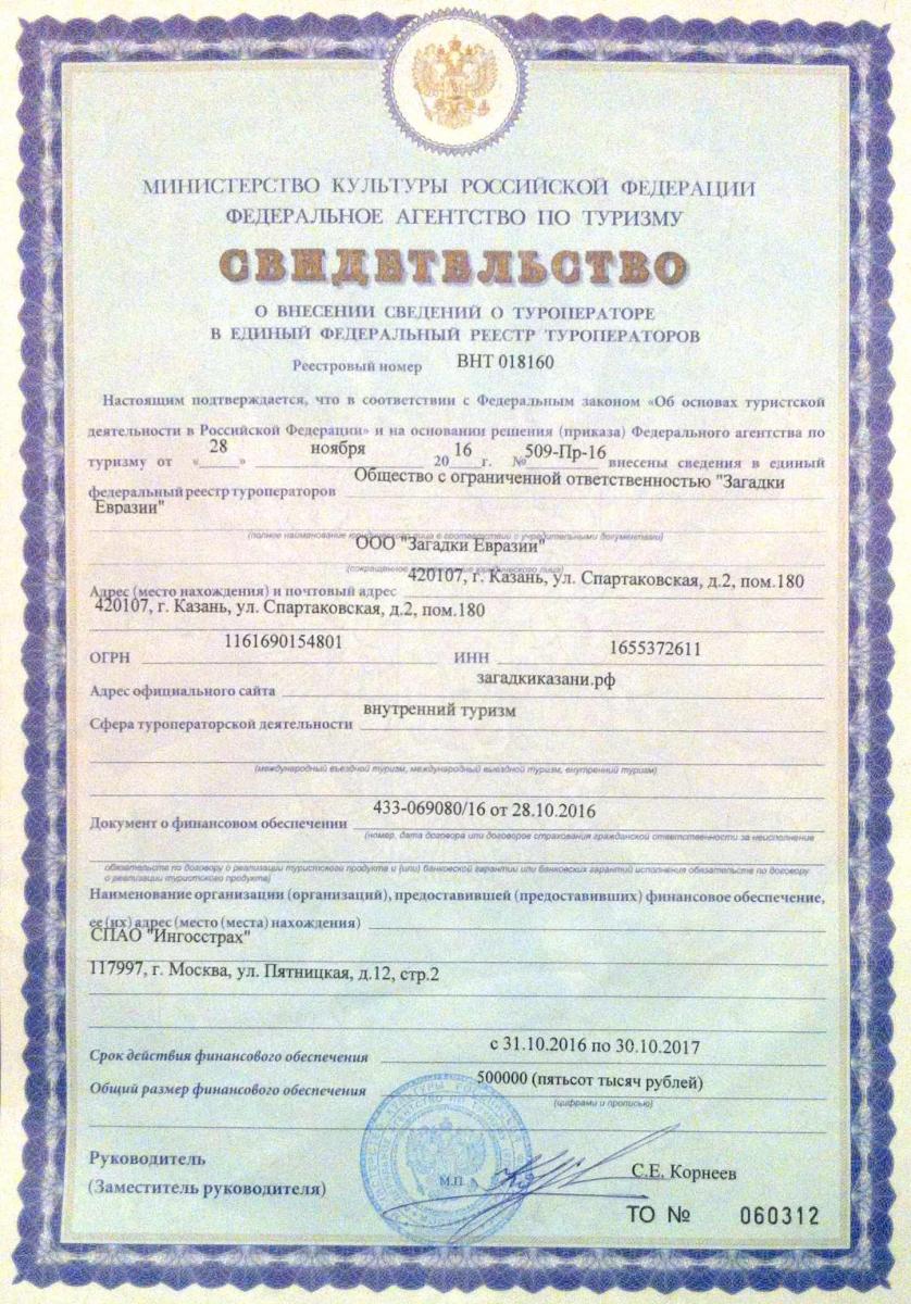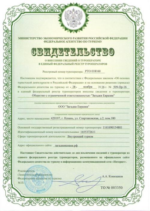 Со стороны турагентсва было предложено заключить договор. В результате совместного обсуждения договора были скорректированы отдельные пункты, и договор был подписан. Тем не менее, я была обеспокоена пунктом перечисления 50% аванса за услуги агентсва. Оплату производила через Сбербанк, там оказалась минимальная комиссия за перечисление по сравнению с Альфа банком, Тинькофф банком и другими. По поступлению денег мне сразу отзвонился представитель фирмы "Загадки Казани".