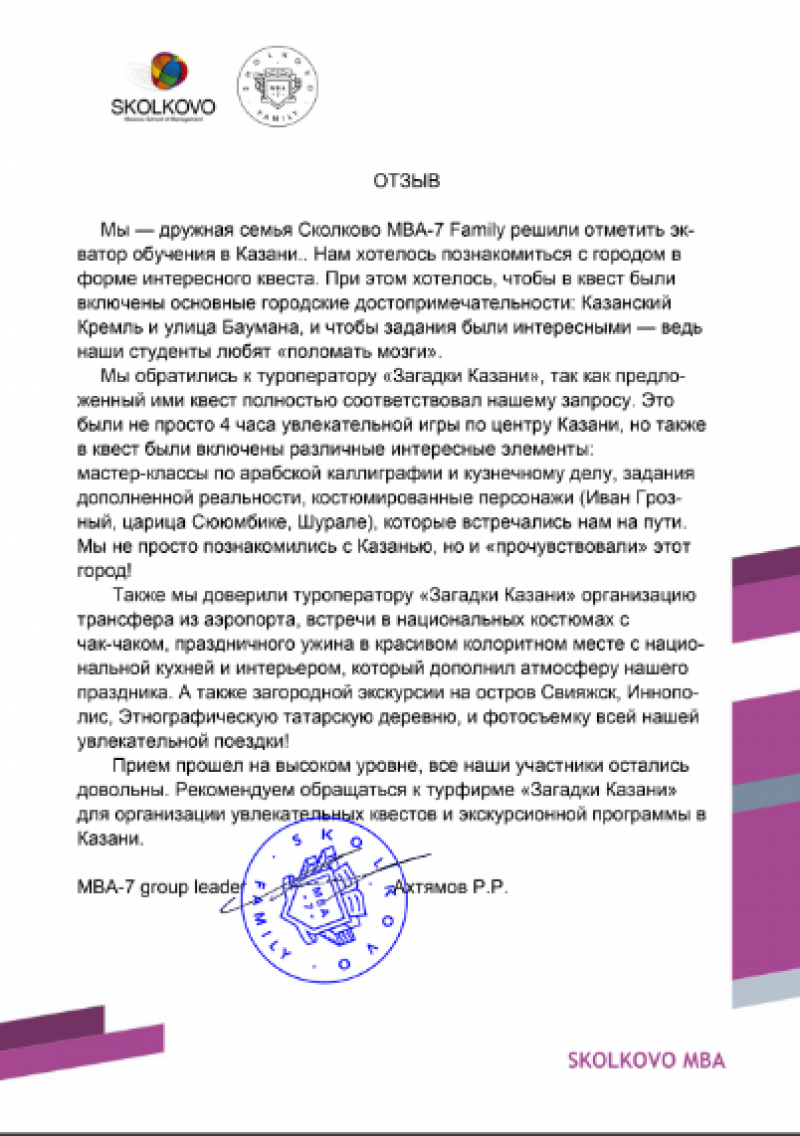 «Наш коллектив рекомендует выбирать квест как форму знакомства с городом и обязательно обращаться к команде туристической фирмы "Загадки Казани" для его проведения.»