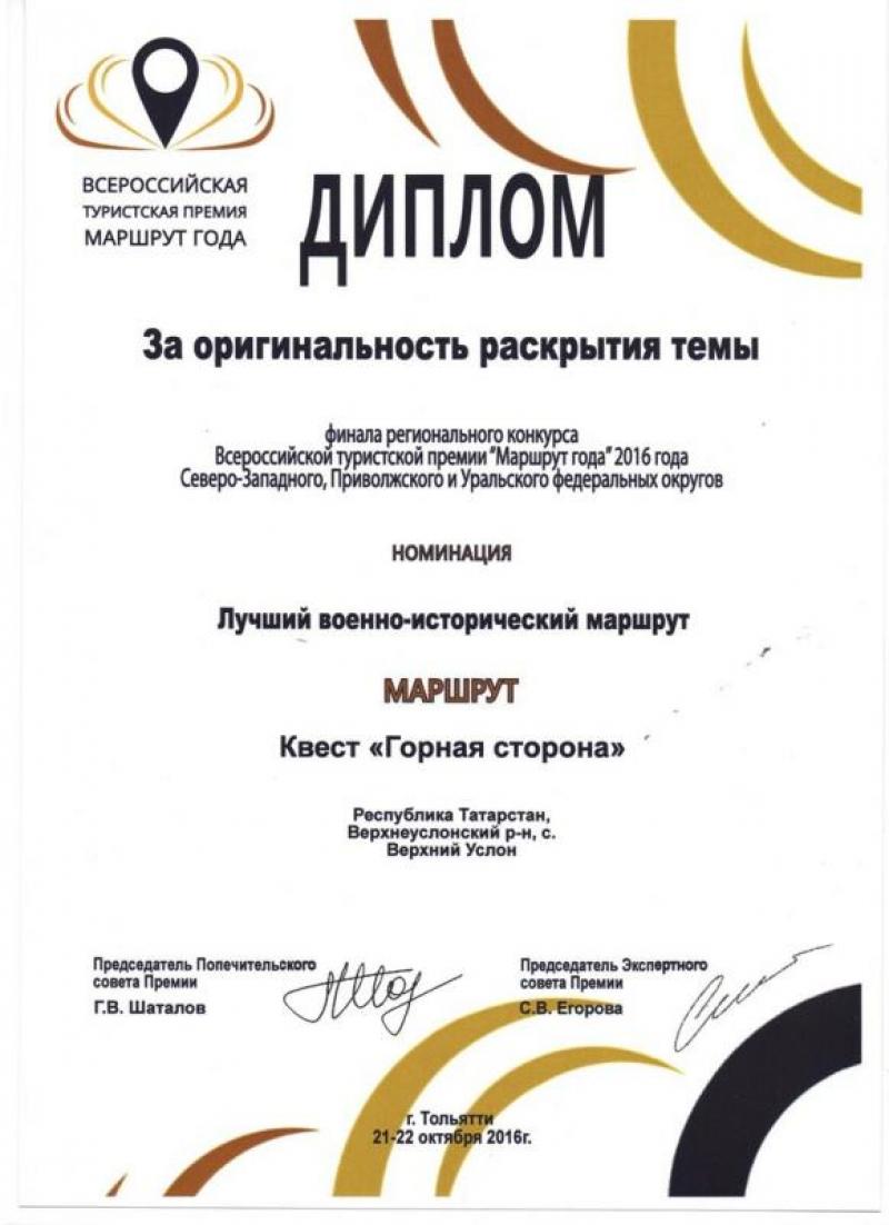 Диплом "за оригинальность раскрытия темы" Всероссийской туристической премии "Маршрут Года 2016"
