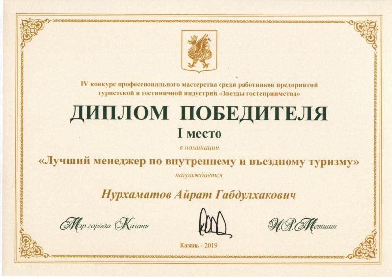 Вчера в Казанской ратуше подвели итоги туристического конкурса "Звезды гостеприимства". Наш менеджер Айрат Нурхаматов занял I место и лично из рук мэра получил диплом и звезду "лучшего менеджера по внутреннему и въездному туризму". Публикуем фотографии с церемонии награждения и искренне поздравляем Айрата с победой!