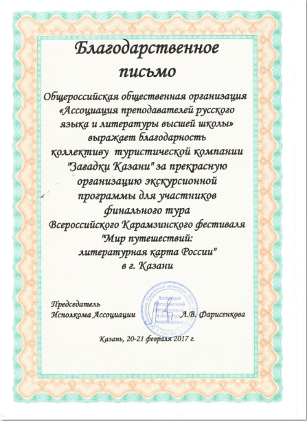 Общероссийская общественная организация "Ассоциация преподавателей русского языка и литературы высшей школы" выражает благодарность коллективу туристической компании "Загадки Казани" за прекрасную организацию экскурсионной программы для участников финального тура Всероссийского Карамзинского фестиваля "Мир путешествий: литературная карта России" в г. Казани