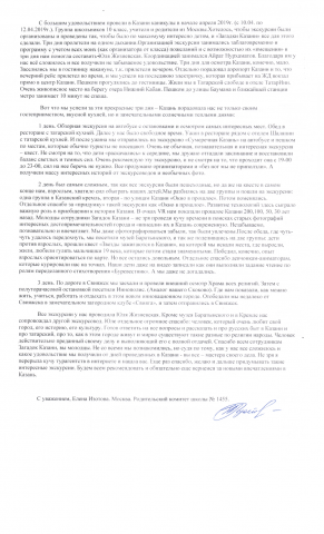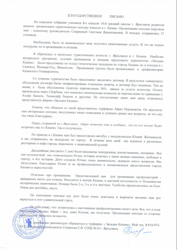 Администрация МОУ "Средней общеобразовательной школы №10" г. Ярославля в лице директора Ключниковой Марины Николаевны выражает благодарность "Загадки Казани" (ООО "Загадки Евразии")  за организацию экскурсионной поездки учеников 8-х и 10-х классов нашей школы