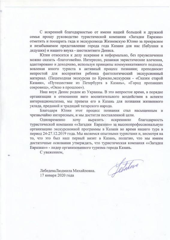 С искренней благодарностью от имени нашей большой и дружной семьи прошу руководство туристическсой компании "Загадки Евразии" отметить и поощрить гида и экскурсовода Жизневскую Юлию за прекрасное и незабываемое представление города Казани для нас (бабушки и дедушки)  нашего внука - шестилетнего Дениса.