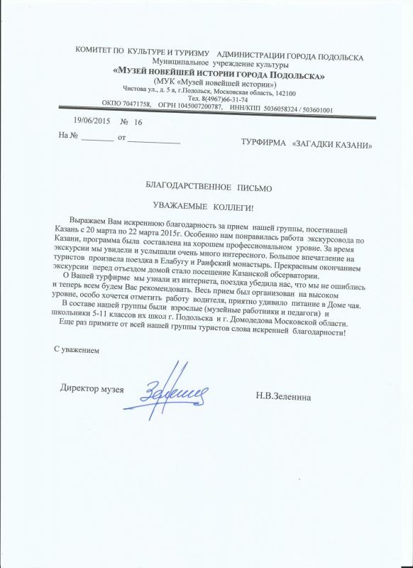 Выражаем Вам искреннюю благодарность за прием нашей группы, посетившей Казань с 20 марта по 22 марта 2015г. Особенно нам понравилась работа экскурсовода по Казани, программа была составлена на хорошем профессиональном уровне. За время экскурсии мы увидели и услышали очень много интересного. Большое впечатление на туристов произвела поездка в Елабугу и Раифский монастырь. Прекрасным окончанием экскурсии перед отъездом домой стало посещение Казанской обсерватории.