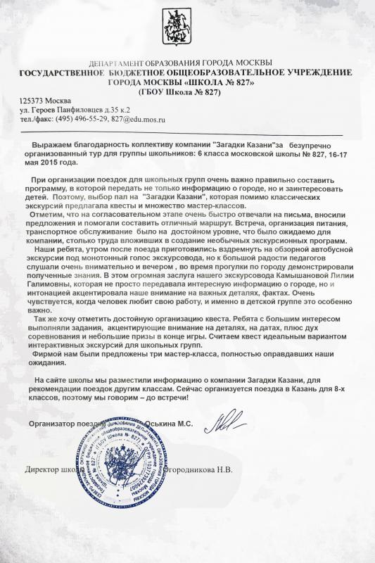 Выражаем благодарность коллективу компании "Загадки Казани" за безупречно организованный тур для группы школьников: 6 класса московской школы №827,16-17 мая 2015 года.