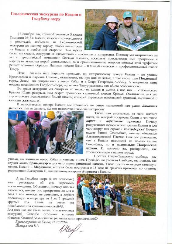 16 октября мы, группой учеников 5 класса Гимназии № 7 г. Казани, классного руководителя и родителей, побывали на Геологической экскурсии по нашему городу, чтобы посмотреть на Казань с необычной стороны. Нам нужна была, так сказать, экскурсия «с изюминкой» - необычная и интересная. Поэтому мы отправились на нее с туристической компанией «Загадки Казани», поскольку предлагаемые ими программы и маршруты являются порой уникальными, да и организационные вопросы команда этой турфирмы решает должным образом. Нашими гидами были — Юлия Жизневская и профессиональный геолог Тимур.