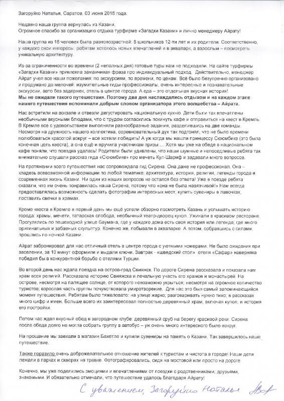 С искренней благодарностью от имени нашей большой и дружной семьи прошу руководство туристическсой компании "Загадки Евразии" отметить и поощрить гида и экскурсовода Жизневскую Юлию за прекрасное и незабываемое представление города Казани для нас (бабушки и дедушки) нашего внука - шестилетнего Дениса.